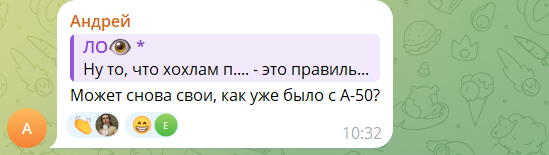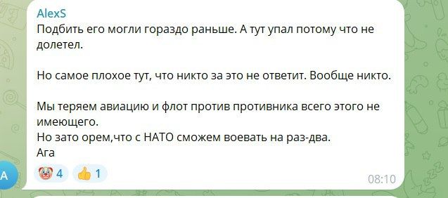 Росіяни ж на втрату бомбардувальника реагують неоднозначно. Одні говорять, що найголовніше – життя пілотів. Втім, двоє пілотів загинуло, а ще одного – й досі не знайшли. Більшість користувачів обурена й не вірить, що українські військові могли збити Ту-22М3. Окупантам легше повірити в "невловимих агентів", які підбили літак у Росії. Деякі припускають, що збити літак могла й російська "пе-ве-о", як нібито було у випадку з падінням А-50. Тоді українські захисники також змогли підбити літак, однак кремлівська пропаганда заявила про friendly fire.
