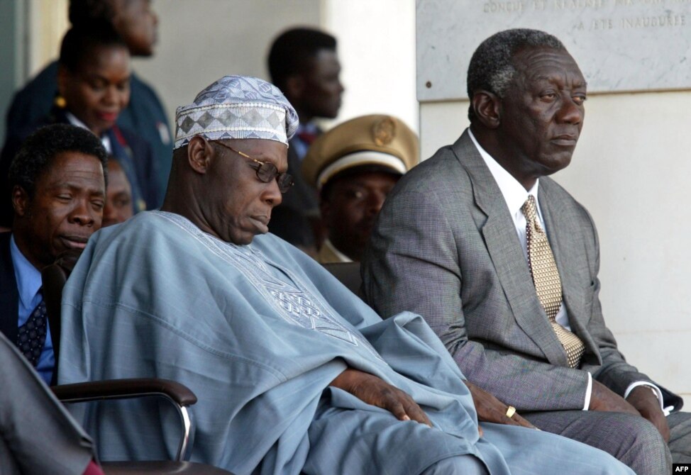 Нігерійський президент Олусегун Обасаньо (ліворуч) і президент Гани Джон Куфуор із цікавістю спостерігають за історичним парадом в Того.