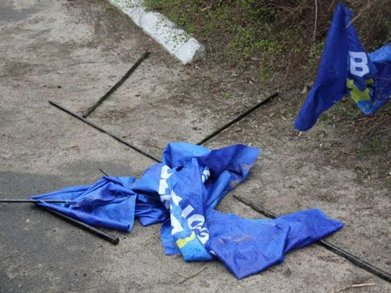 Декілька прапорів Партії регіонів порвали на шматки чоловіки у військовій формі з нашивками "українське козацтво".