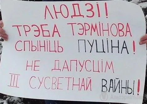 У руках активіст тримав плакат: "Людзі! Треба тэрмінова спыніць Пуціна! НЕ 3 СУСВЕТНАЙ ВАЙНЕ!" ("Люди, потрібно терміново зупинити Путіна! Ні - третій світовій війні!"), також активіст мав на плечах біло-червоно-білий прапор.