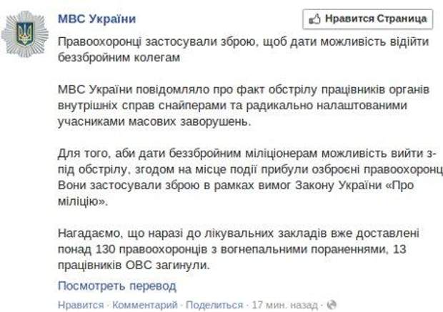 МВС України повідомляло про факт обстрілу працівників органів внутрішніх справ снайперами та радикально налаштованими учасниками масових заворушень.