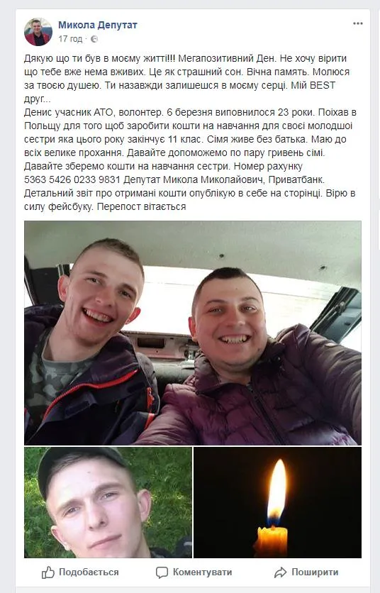 "Денис – учасник АТО, волонтер. 6 березня виповнилося 23 роки. Поїхав в Польщу для того, щоб заробити кошти на навчання для своєї молодшої сестри, яка цього року закінчує 11 клас", – зазначив Микола Депутат.