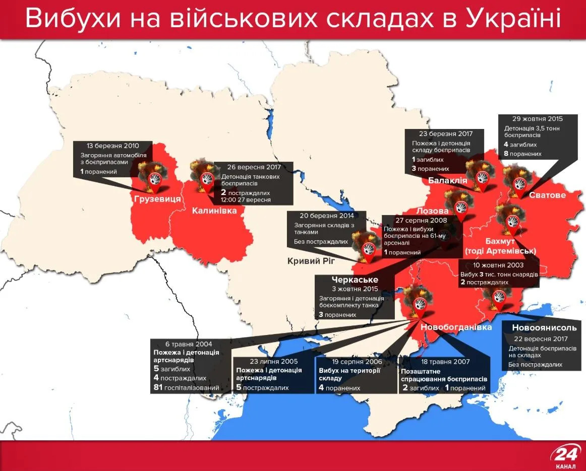 Де ще в Україні вибухали військові склади: