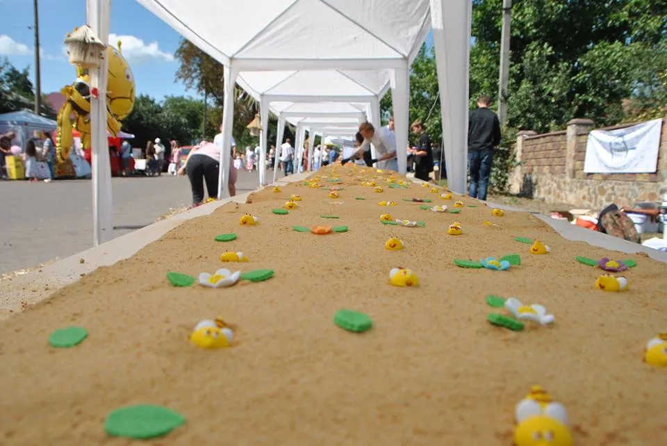 "148 кілограм борошна, 553 яйця, 27,85 кілограм масла, 48 кілограм меду, 80 кілограм цукру, 138 кілограм сметани, 0,3 кілограма ваніліну, 1,6 кілограм соди, 800 "бджілок", столи, тарілки, скатертини, дошка, транспорт... Десь прочитала про те, що торт був схожий на купу піску. Дай вам Боже, кожному мати таку купу! Зі святом!", – написала Любов Романюк у Facebook.