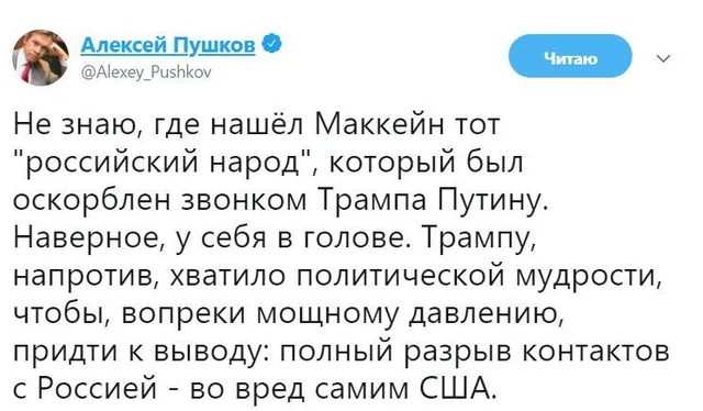 "Не знаю, де знайшов Маккейн той "російський народ", який був ображений дзвінком Трампа Путіну. Напевно, у себе в голові. Трампу, навпаки, вистачило політичної мудрості, щоб, всупереч потужному тиску, прийти до висновку: повний розрив контактів з Росією – на шкоду самим США ", – написав Пушков.