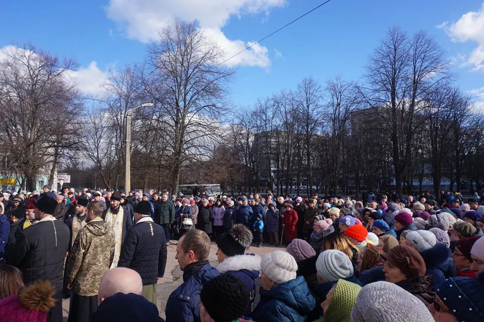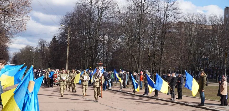 Як видно з фото, далі люди сформували колону та так проводжали труну із загиблим оборонцем. Уздовж шляху колону зустрічали містяни, які тримали у руках національні прапори.
