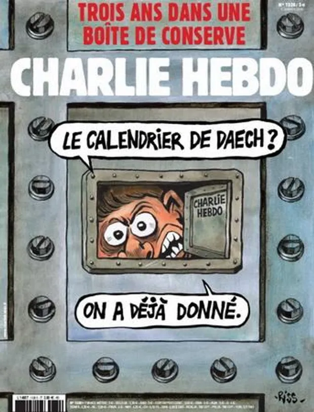 Додамо, що на обкладинці останнього спецвипуску зображено металеві двері з невеличким віконцем, на якому написано Charlie Hebdo. З нього виглядає частина людського обличчя. Малюнок супроводжується підписом "Календар ІДІЛ? У нас вже є".
