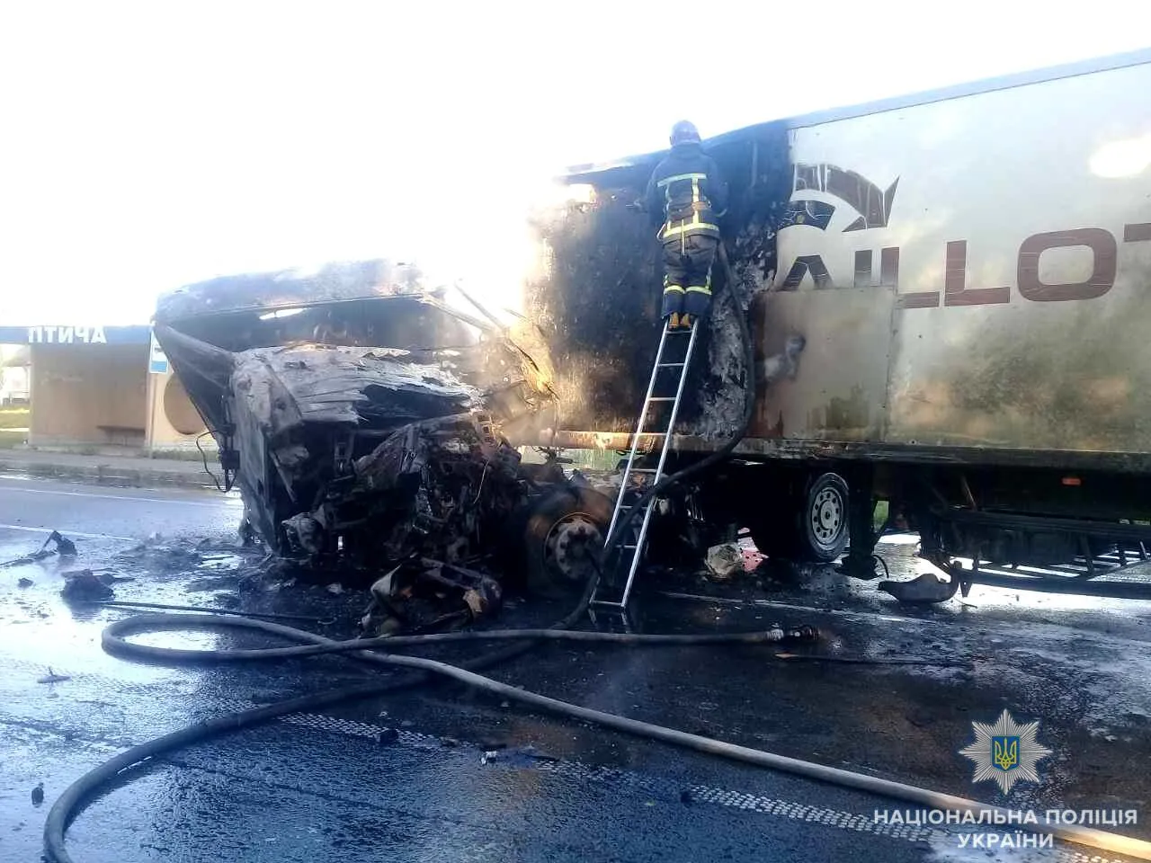 Унаслідок зіткнення вантажівка "DAF" загорілася. У пожежі загинув і її кермувальник. Ще один водій вантажівки, 41-річний мешканець Житомирської області, не постраждав.