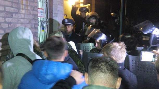 Міліціонери намагаються зупинити присутніх щитами. Члени ТВК у будівлю ще не потрапили. За версією правоохоронців — вони, ймовірно, просто бояться підходити до друкарні.