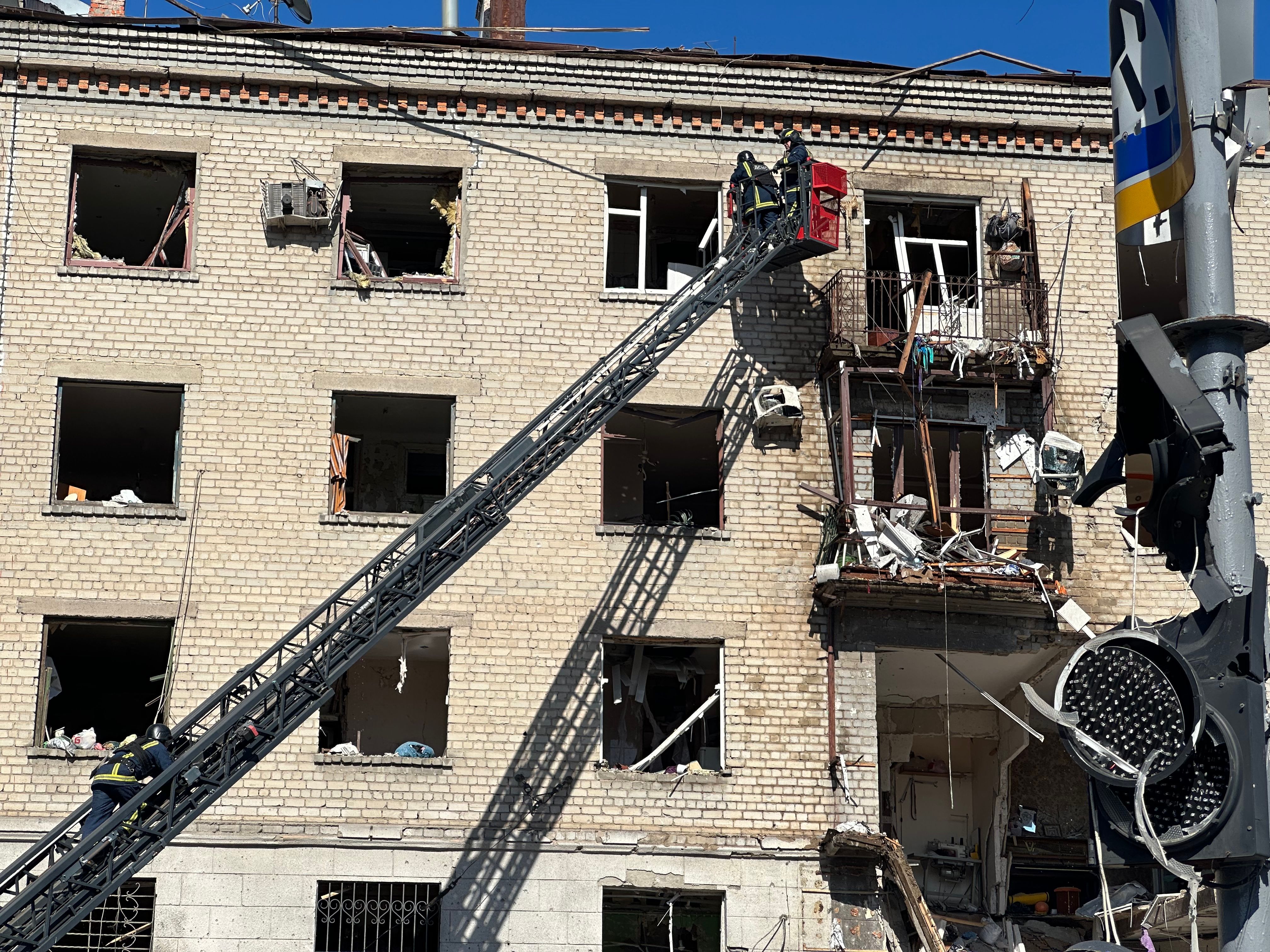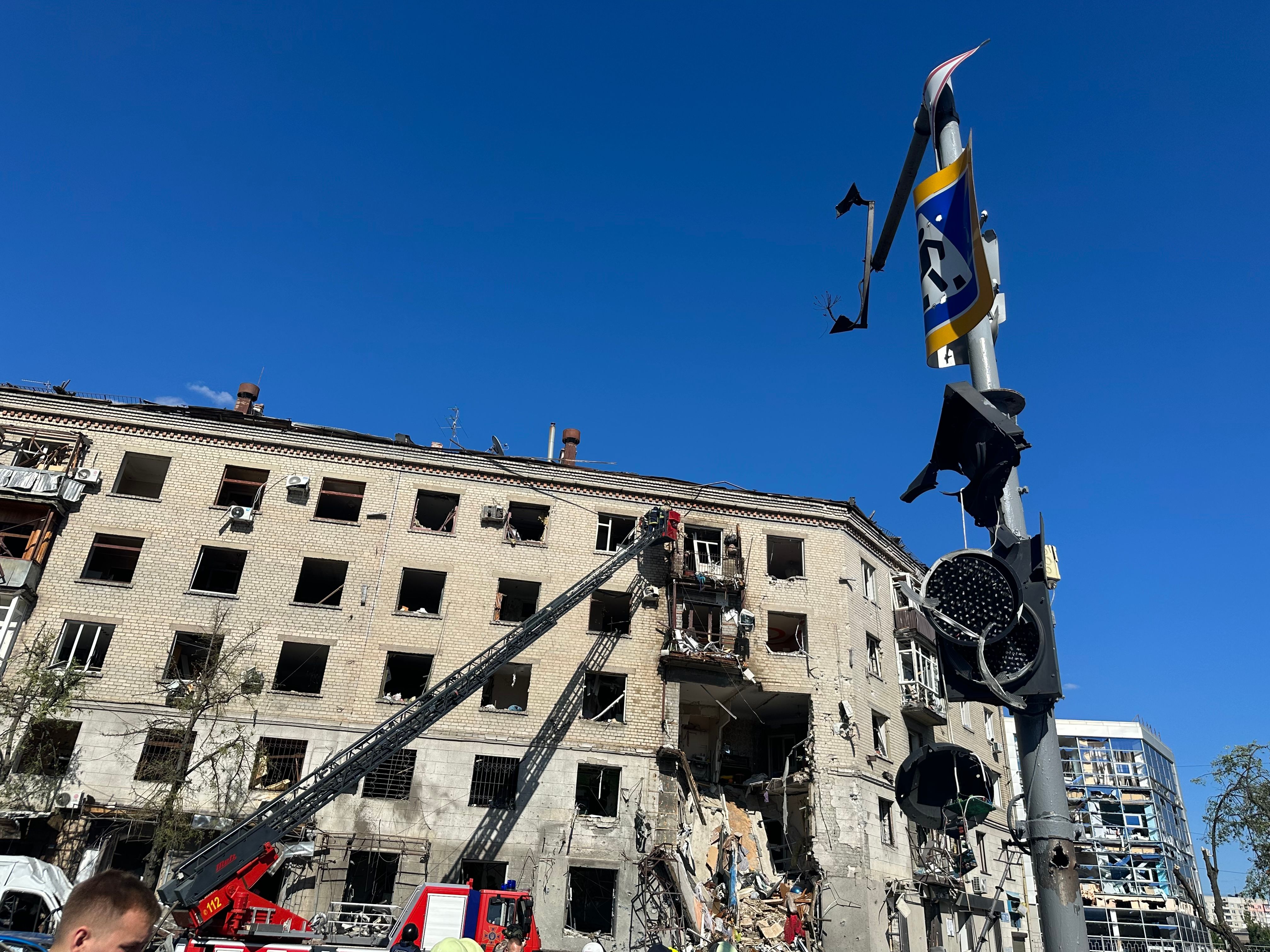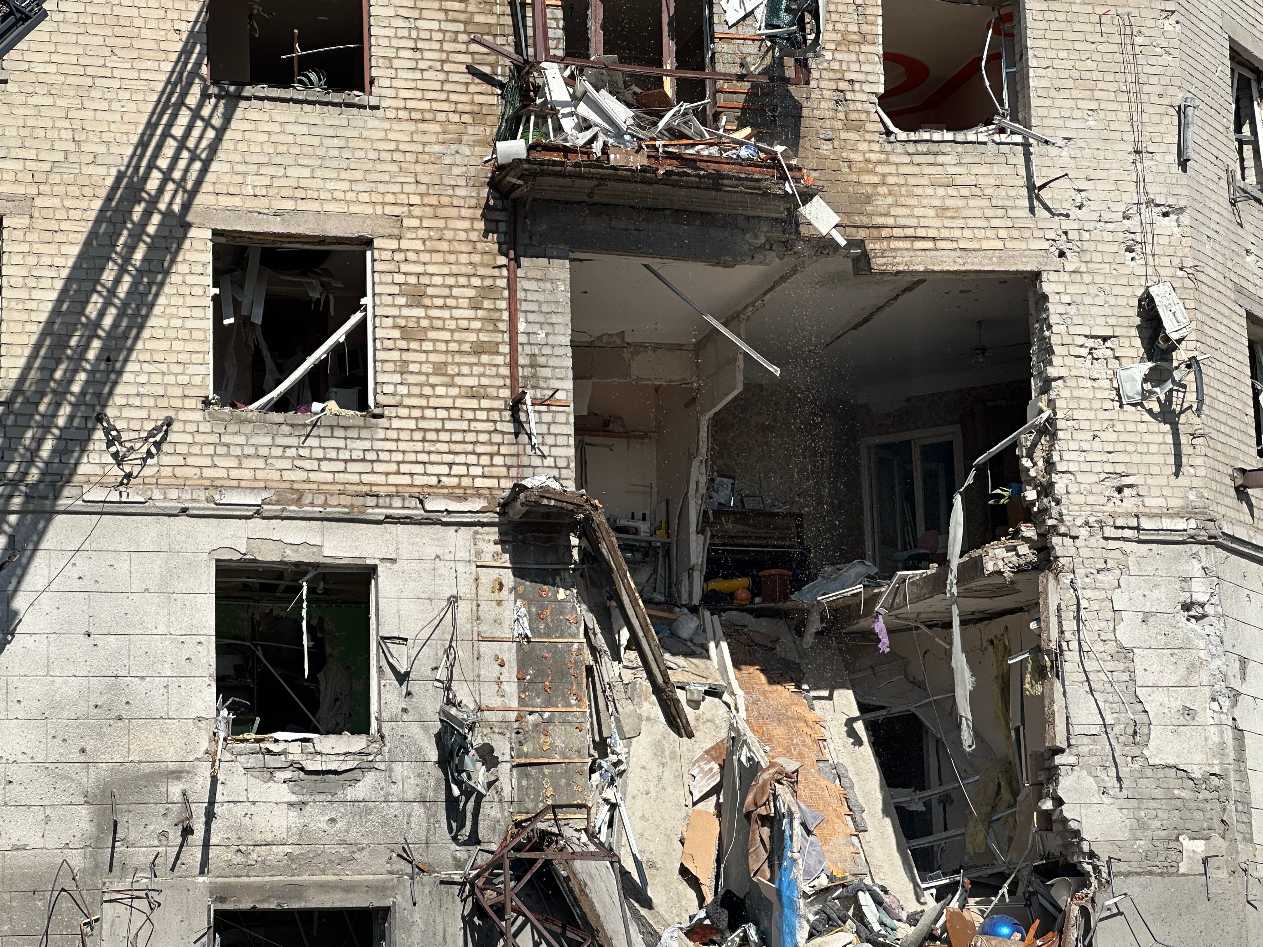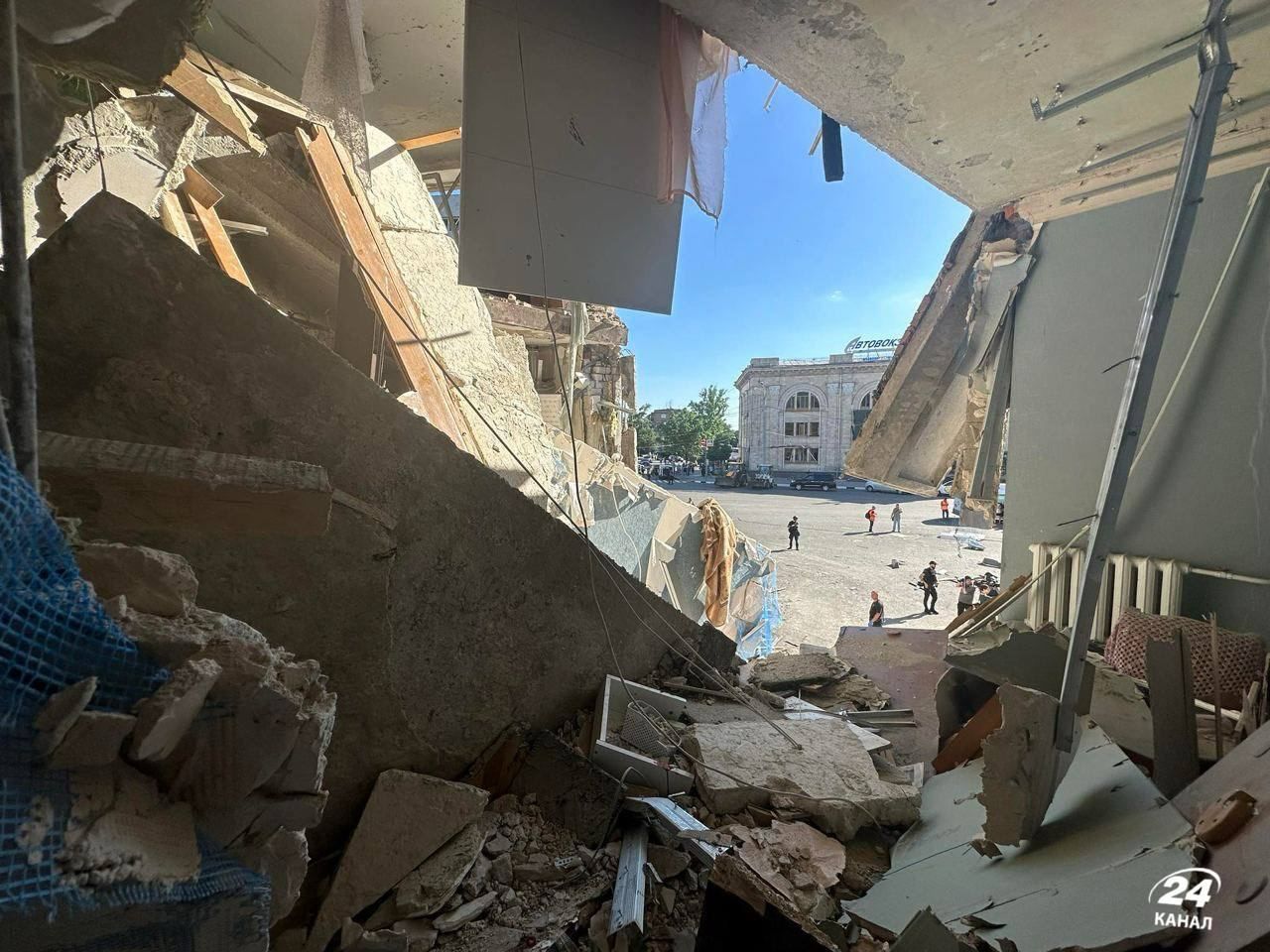 Один зі снарядів влучив у багатоповерхівку. Рятувальники прибули на місце удару й почали розбір завалів. На ексклюзивних кадрах 24 Каналу видно, що конструкція будинку серйозно пошкоджена, а перекриття між поверхами зруйновано.