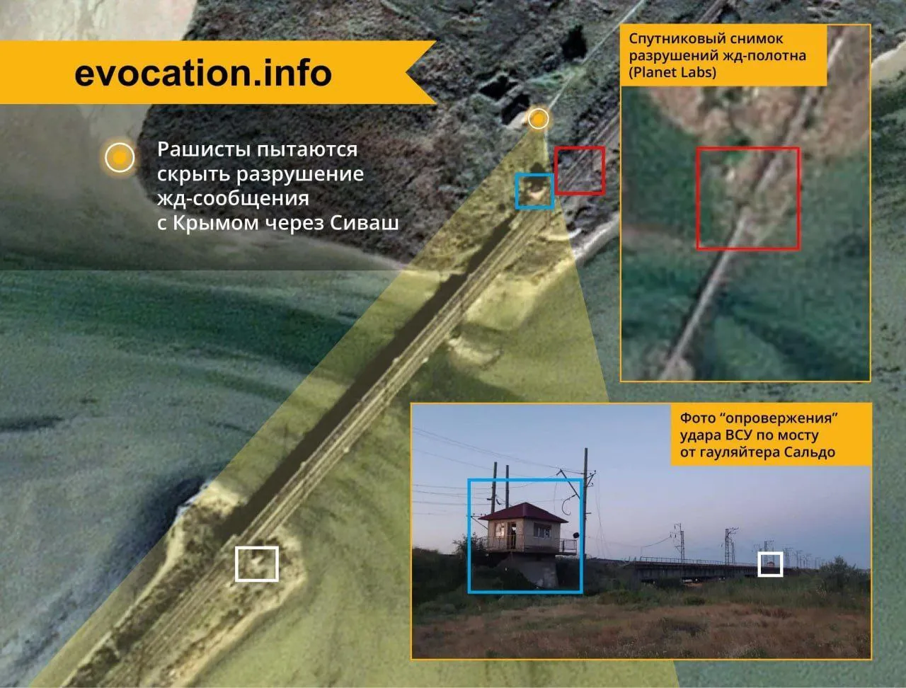 Водночас самі росіяни й колаборанти намагалися приховати влучання по залізничному проїзду, зазначивши, що "все добре". Так, гауляйтер Владімір Сальдо опублікував фото Чонгарського мосту за кількасот метрів від місця прильоту.