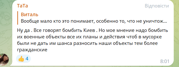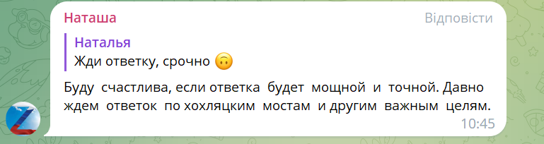 Вже традиційно "прості росіяни" після звістки про удар по мосту почали погрожувати новими атаками на цивільні об'єкти України – зокрема, запропонували знову бомбити і столицю України, Київ. Деякі з них заявляють, що "отвєтку" Україна має отримати терміново, а удари мають бути "точними та потужними".