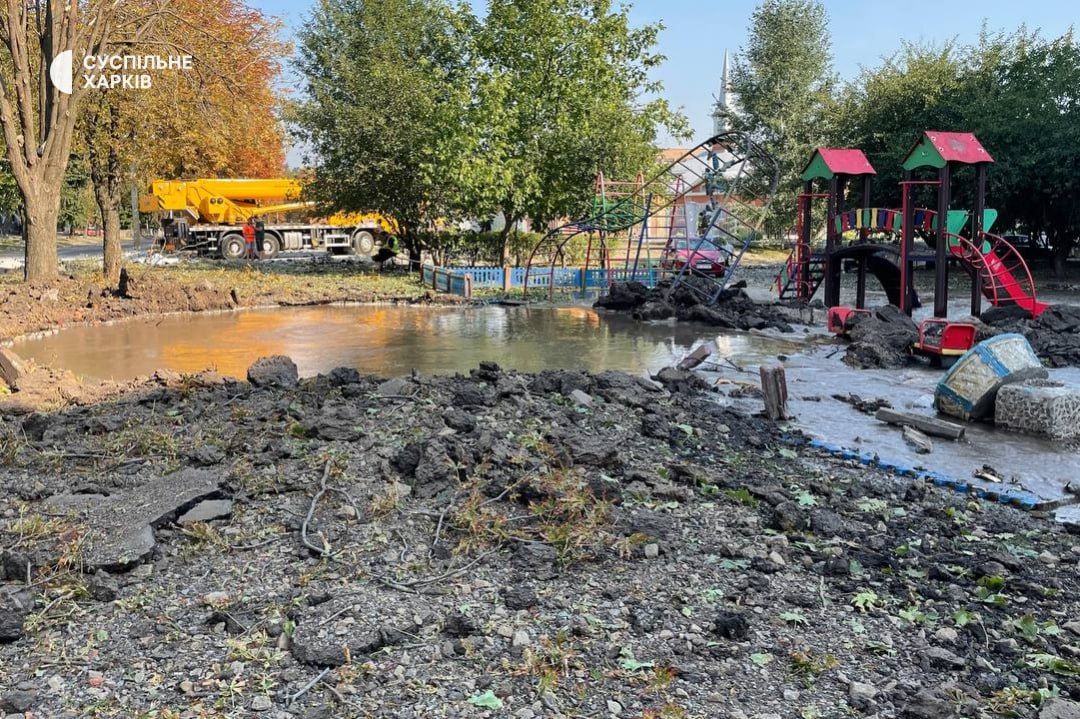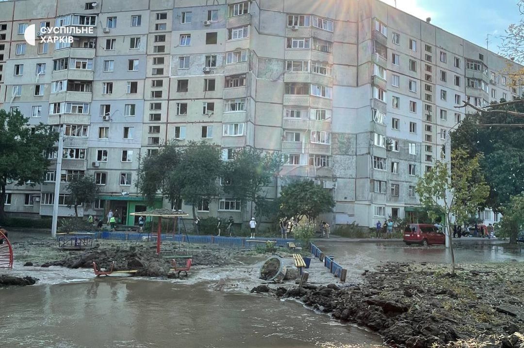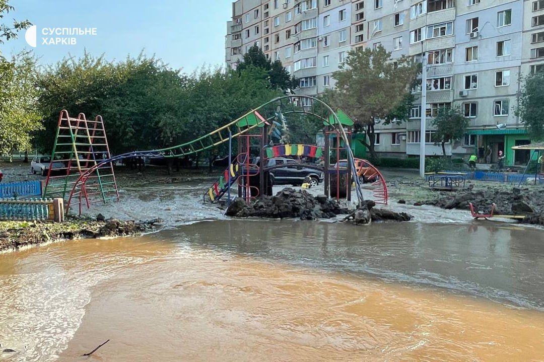 Внаслідок одного з влучань у Немишлянському районі пошкоджено водогін. Дитячий майданчик та прибудинкову територію одного з будинків затопило. У ЗМІ показали страшні кадри.