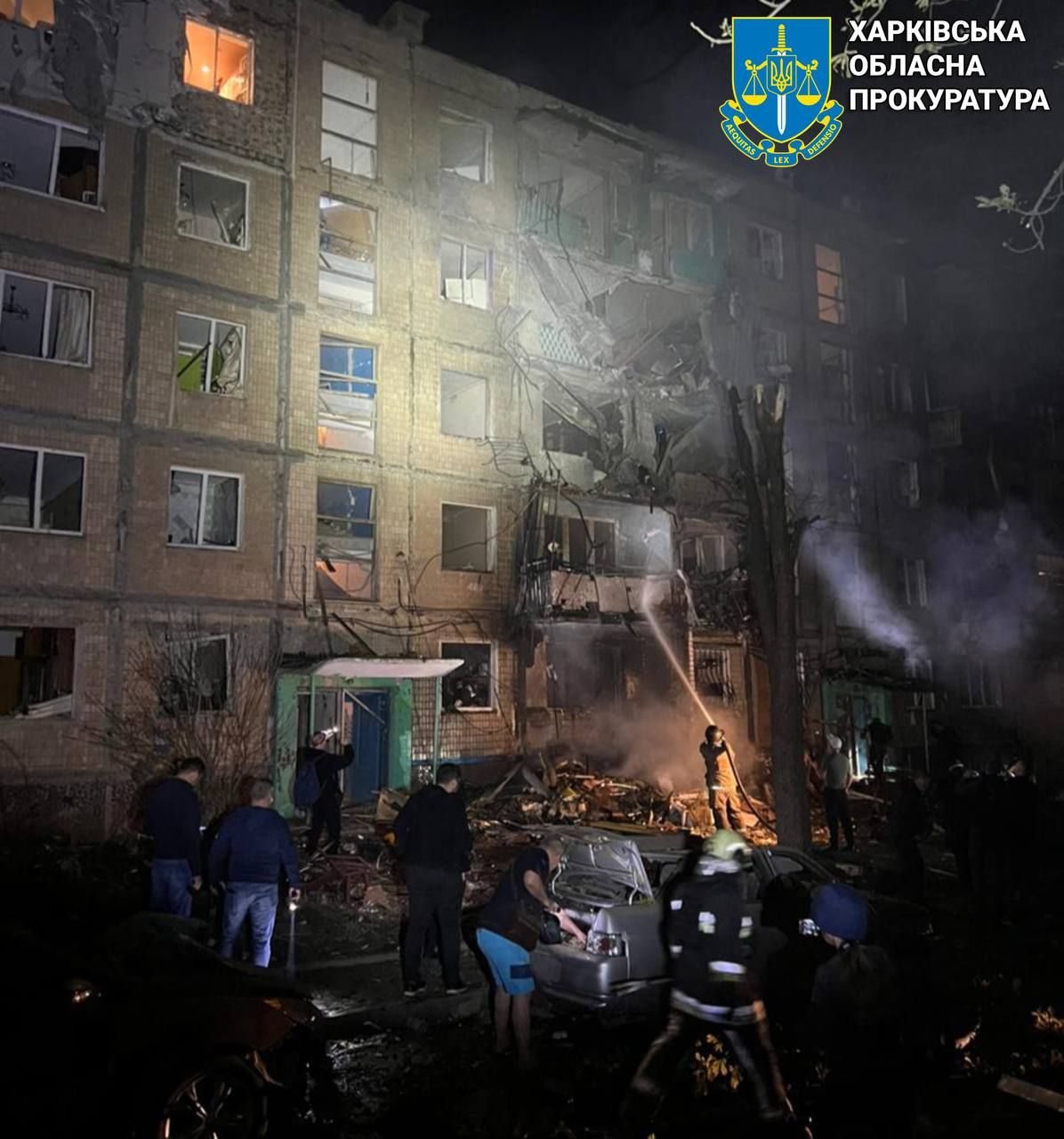 Один із них влучив між третім та четвертим поверхом пʼятиповерхового житлового будинку у Салтівському районі міста. Там зайнялась пожежа.