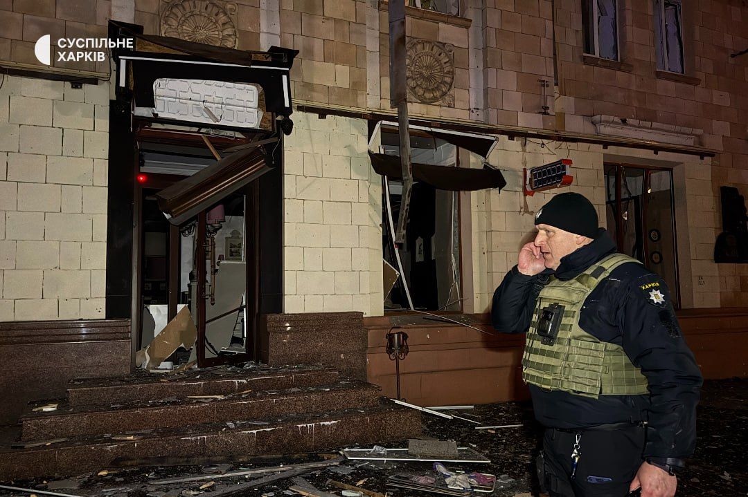Унаслідок російської атаки постраждало й середмістя Харкова. Вибух пошкодив скління та фасад 7-поверхового житлового будинку.