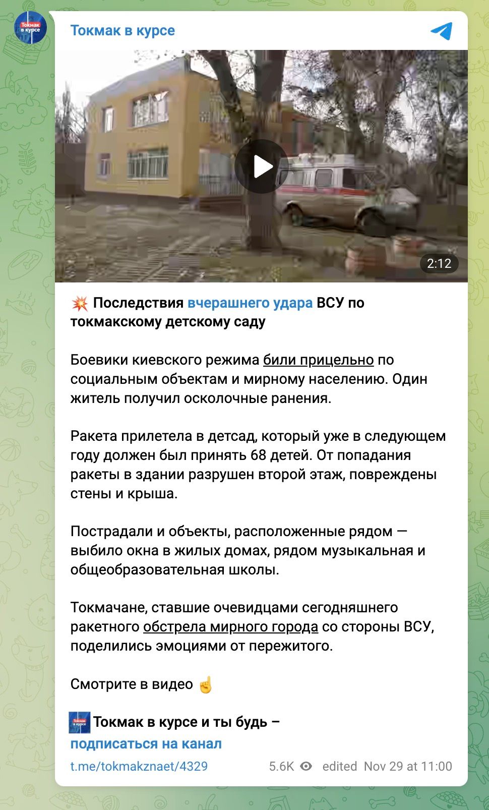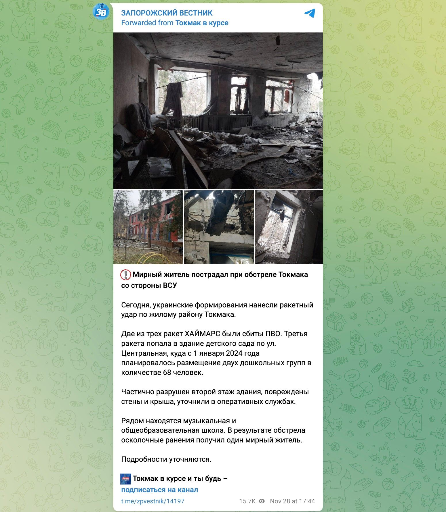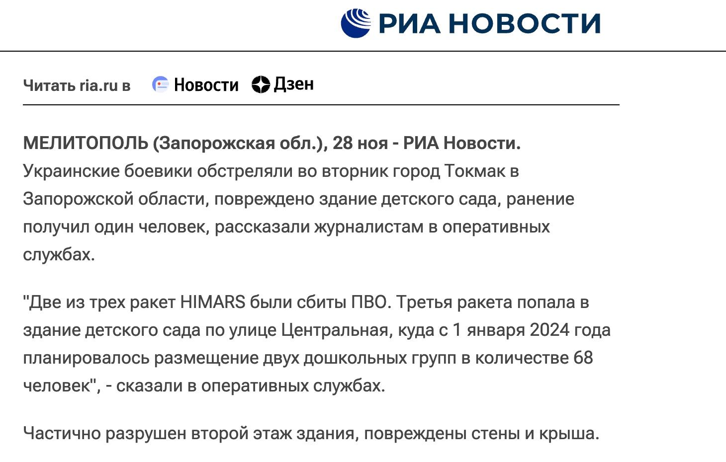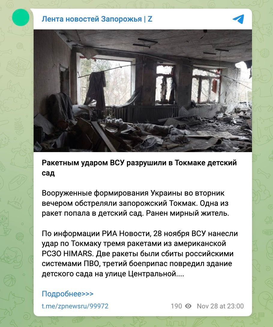 Так, у вівторок, 28 листопада, українська армія уразила район скупчення окупантів у Токмаку Запорізької області. Згодом російські псевдожурналісти заявили про обстріл дитячого садочка. З цього можна зробити висновок, що удар був результативним, – інформує 24 Канал.