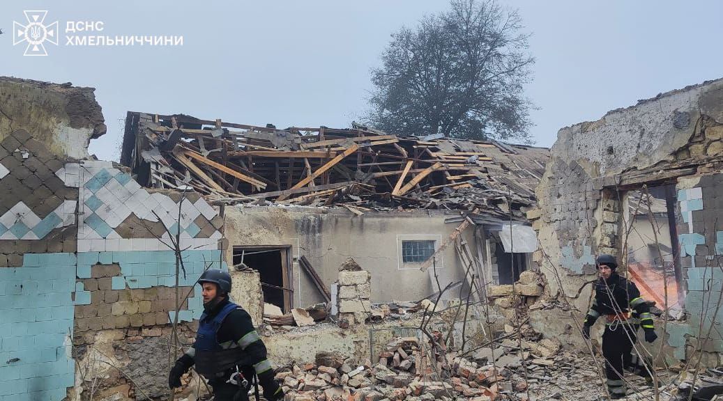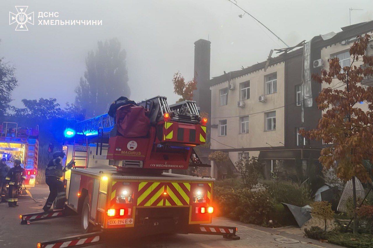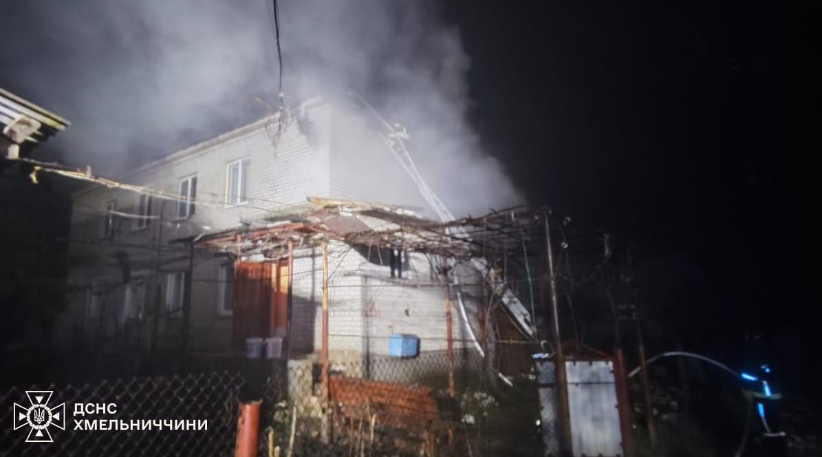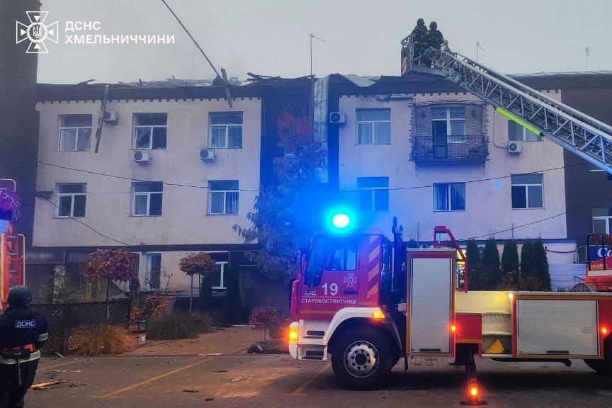 Так, у Старокостянтинові внаслідок падіння уламків пошкоджено готель та двоповерховий будинок, виникли пожежі. У ДСНС України показали кадри руйнувань.