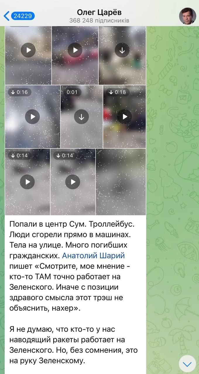 Більшість пропагандистів взагалі заперечують причетність власних військових до обстрілу Сум. Вони кричать про "провокацію Зеленського", про спробу Києва "відтворити з попелу дух Бучі". Росіяни стверджують, що Україна нібито сама вдарила по своєму місту. Ба більше, деякі навіть цинічно кажуть, що балістика прилетіла по Сумах не з Росії, а з Лондона.
