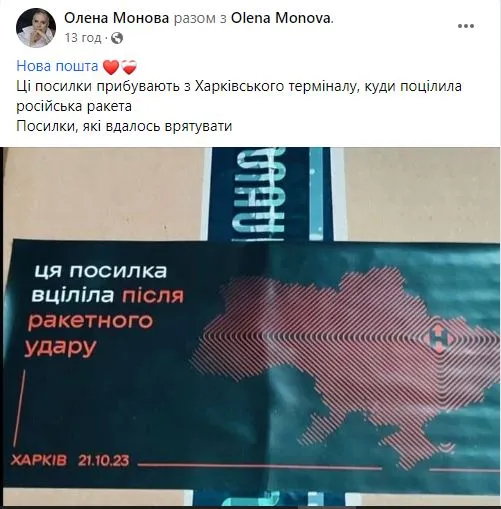 "Нова пошта" маркує ті відправлення, які вціліли після ракетного удару. На кожній такій посилці буде карта України, а Харків на ній позначено логотипом компанії – літерою "Н". Червоні лінії, що відходять від літери, символізують, що вся Україна тужить за загиблими у Харкові. Також компанія змінила своє лого в соцмережах зі звичного червоно-білого кольору на жалобний чорно-білий. Там повідомляли, що вцілілі посилки почнуть відправляти з понеділка 23 жовтня – і от вони доходять до адресатів.