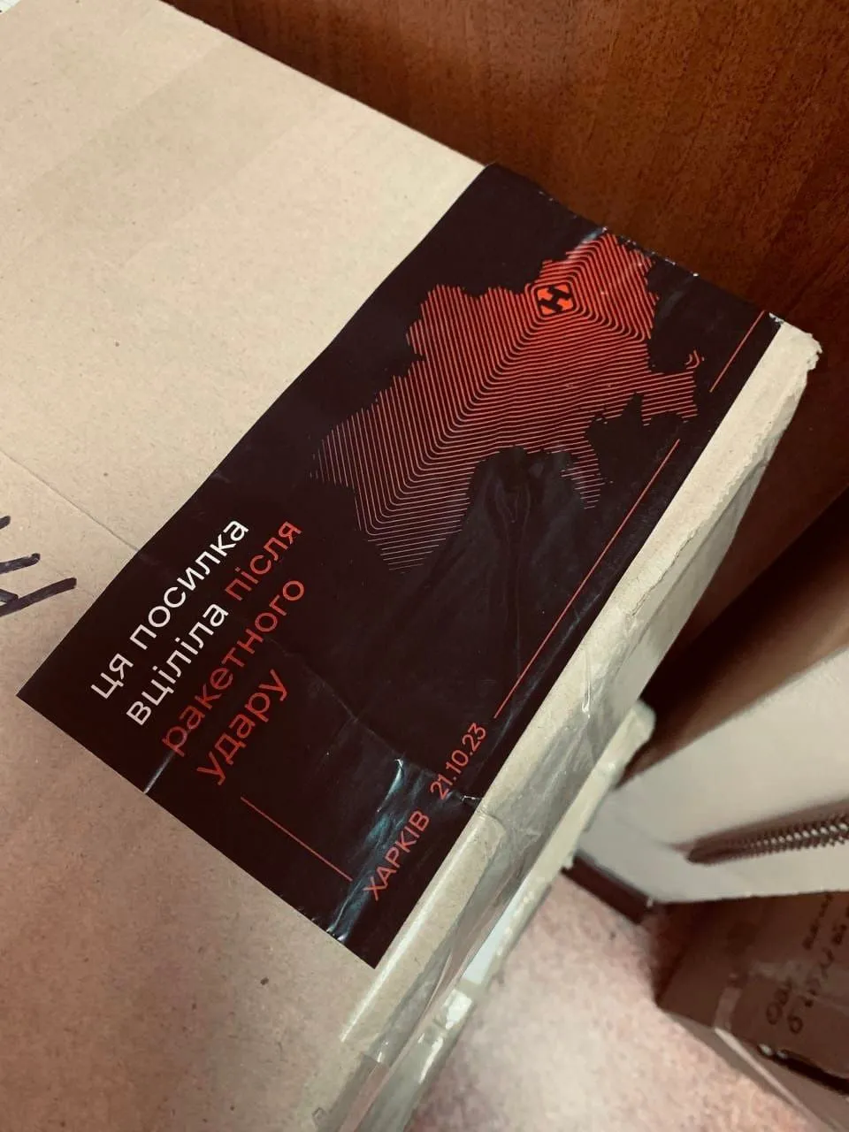 Червоно-чорна наліпка "Нової пошти" свідчила: "Ця посилка вціліла після ракетного удару. 21.10.2023. Харків",