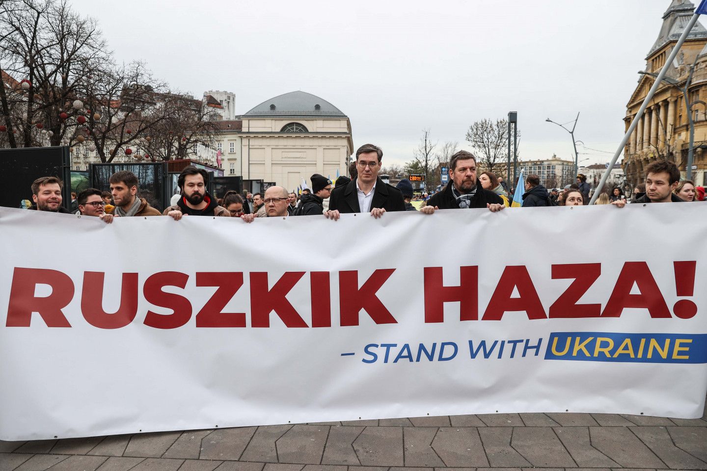 Мітингувальники також встановили сцену біля посольства Росії, на екрані показували зображення наслідків російсько-української війни. Першим виступив мер Будапешта Гергель Корачонь. Свою промову він розпочав з фрази: "Росіяни, додому!", яку одразу підхопив натовп.