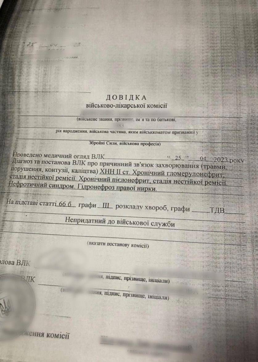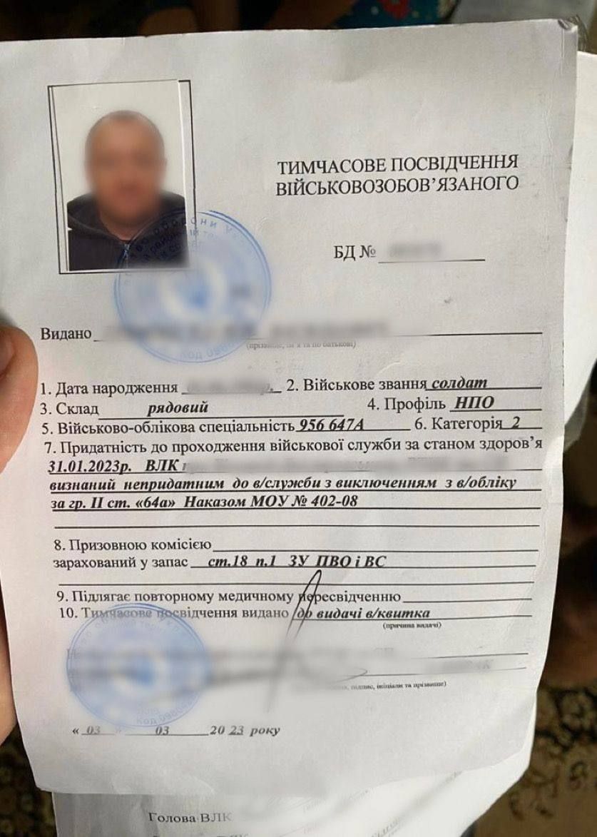 До цього були залучені службові особи районних ТЦК і СП. Разом із членами військово-лікарської комісії (ВЛК) вони налагодили видачу довідок про визнання чоловіків непридатними до військової служби за станом здоров'я. Допомагали їм у цьому треті особи.