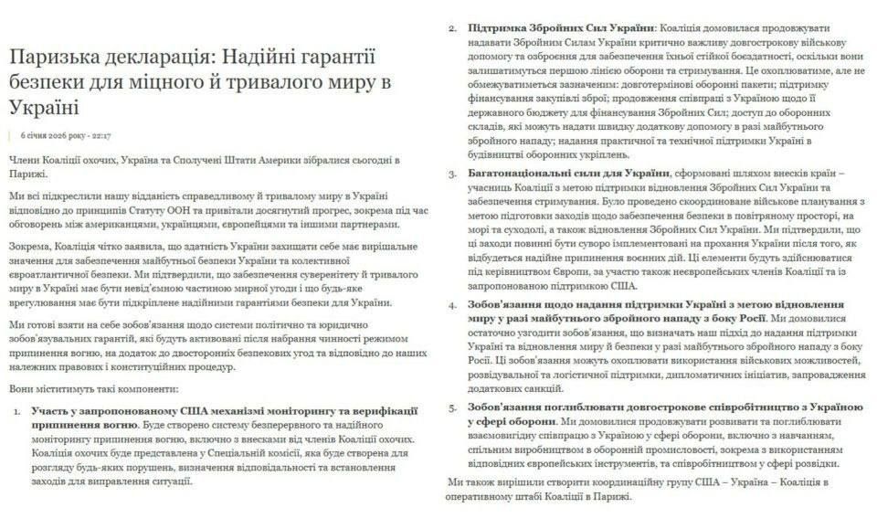 Ця сьогоднішня зустріч знаменує собою значний крок вперед, що відображено в Паризькій декларації про надійні гарантії безпеки для міцного та тривалого миру,