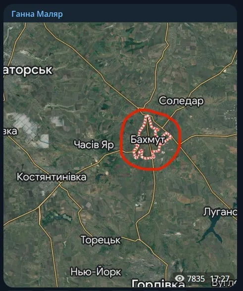 Хвилинами пізніше Ганна Маляр опублікувала карту, на якій обведені кордони Бахмута. Загадково населений пункт додатково обведений червоним колом. Цей допис заступниця міністра ніяк не підписала.