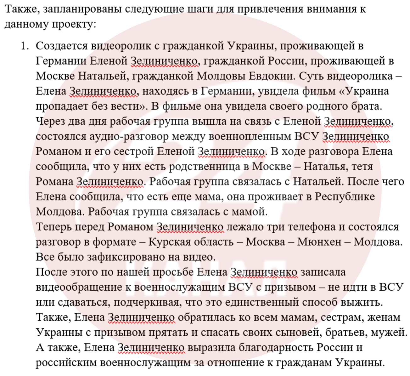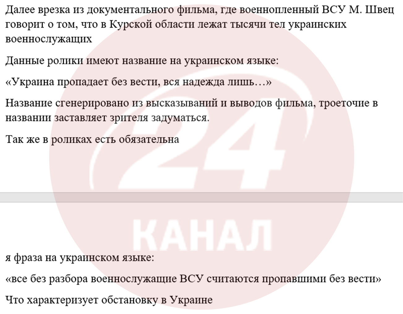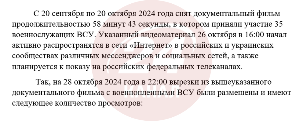 Усе це частина багатоетапної інформаційно-психологічної операції – "Україна зникає безвісти". За даними джерел 24 Каналу, у рамках плану був знятий пропагандистський фільм у період із 20 вересня до 20 жовтня 2024 року за участю 35 військовополонених ЗСУ, стрічку запустили в масове розповсюдження вже 26 жовтня. Її головна мета деморалізація українського суспільства, дискредитація державних інституцій, зокрема військово-політичного керівництва, а також розпалювання недовіри між державою та родинами військовослужбовців.