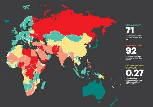 Як зазначають автори рейтингу, в 2018 році глобальний рівень світу погіршився на 0,27%, що стало четвертим роком погіршення. Зокрема, в 2018 році 92 країни показали погіршення показників світу, 71 країна - поліпшення.