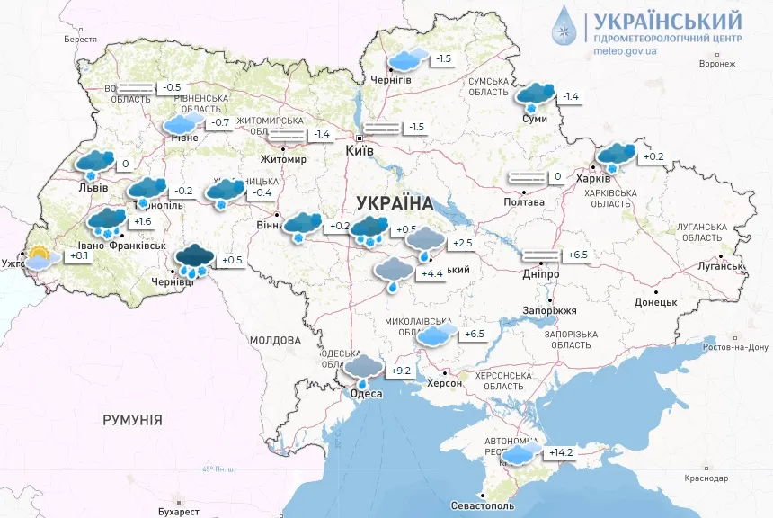Вдень мокрий сніг також очікується в західних областях, ввечері дійде до Житомирщини та Київщини.