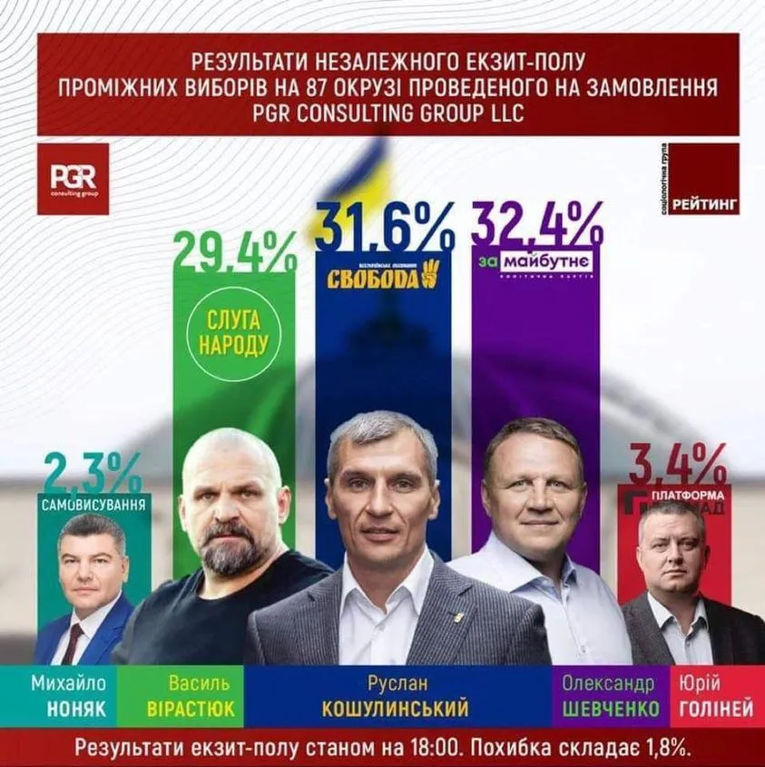 Водночас у "Слузі народу" заявили, що на довиборах до Верховної Ради на 87-му окрузі в Івано-Франківській області, за даними екзитполу "Слуги Народу", перемагає Василь Вірастюк.