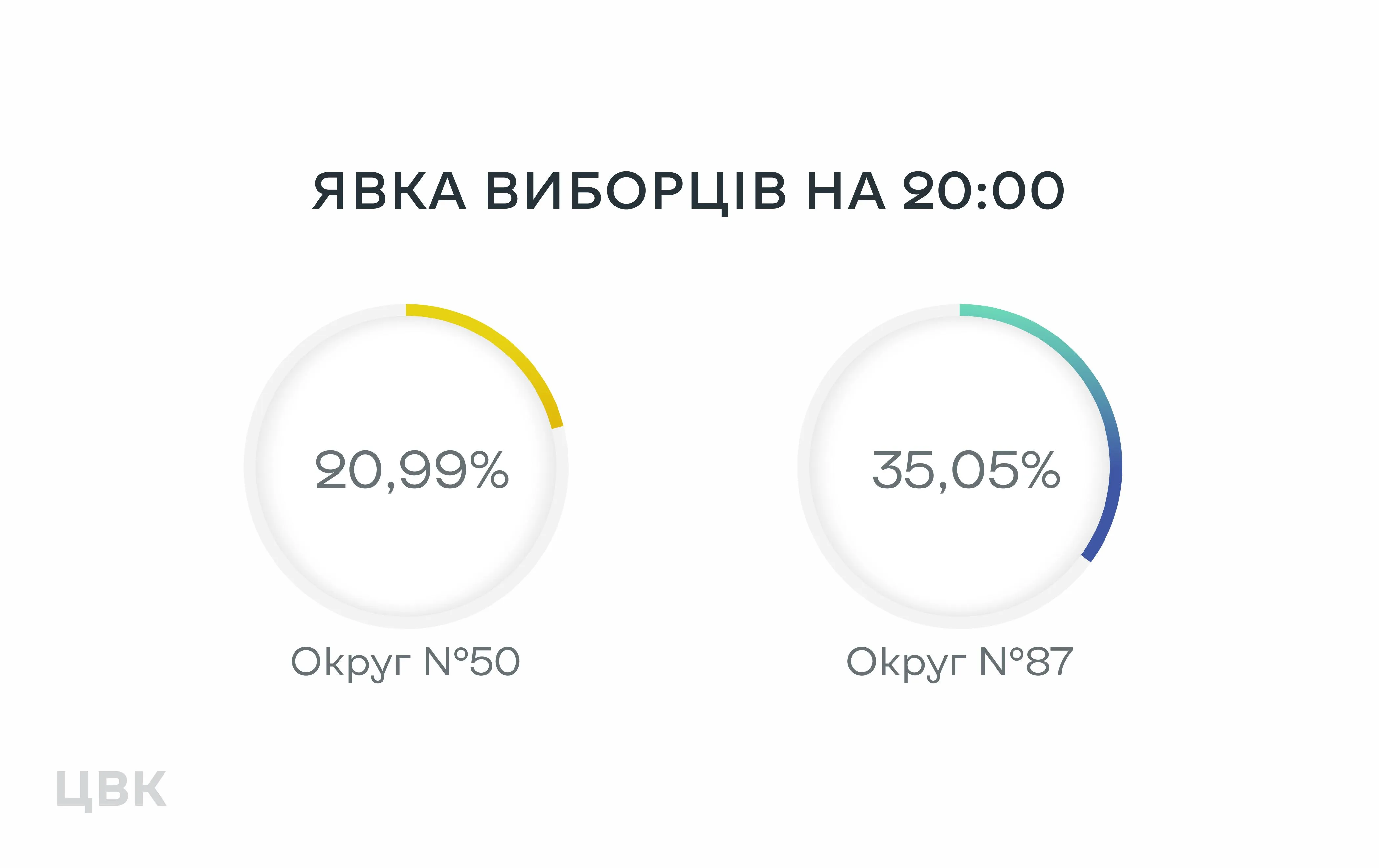 На момент закриття дільниць явка виборців склала 20,99% в окрузі №50 та 35,05% в окрузі №87.