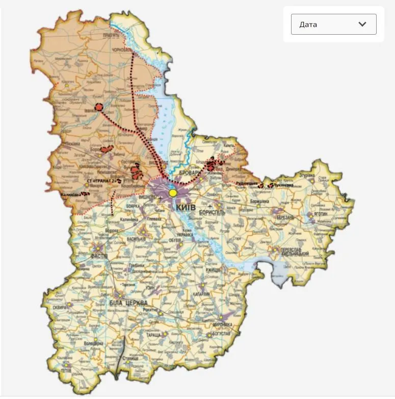 Також можна натиснути на конкретну область і тоді вже показується детальніша карта. Там видно місця атак росіян, де є багато бомб і снарядів. На жаль, працює це поки лише на одному регіоні – Київ.