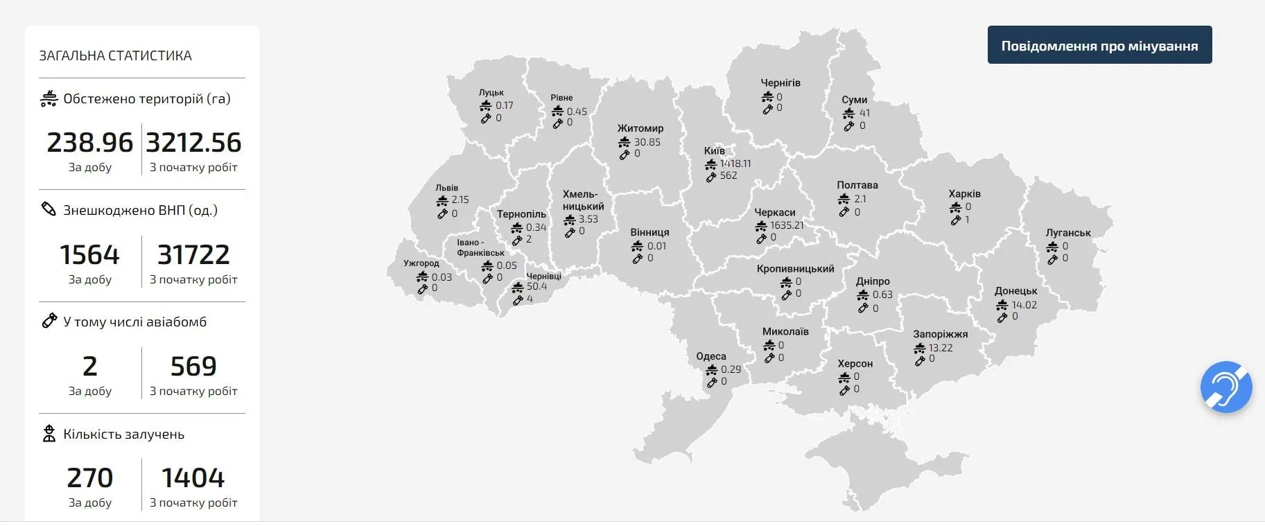 При входженні в новий розділ сайту ДСНС одразу можна побачити карту усіх областей. На кожній вказано кількість знешкоджених боєприпасів і площу, яке вже обстежили.