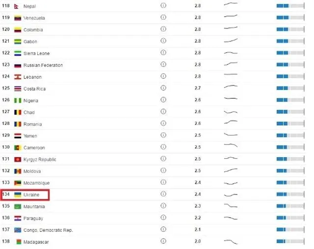 Про це йдеться на сайті міжнародної організації "Всесвітній економічний форум", яка і склала рейтинг.