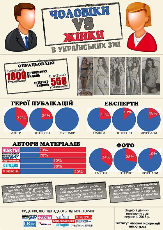 Чоловіки є героями 80%публікацій, лише 20% матеріалів ЗМІ присвячені жінкам. При цьому жінки у переважній більшості випадків згадуються у світській хроніці, плітках про сімейне життя відомих людей, описі суконь тощо.