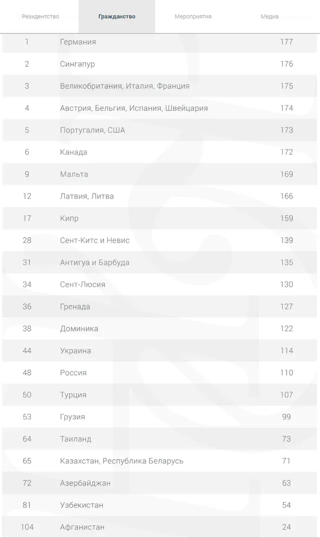 Паспорт США посів п'яте місце – 173 країни. Останнє місце в рейтингу отримав Афганістан, громадяни країни можуть відвідувати без віз лише 24 держави.