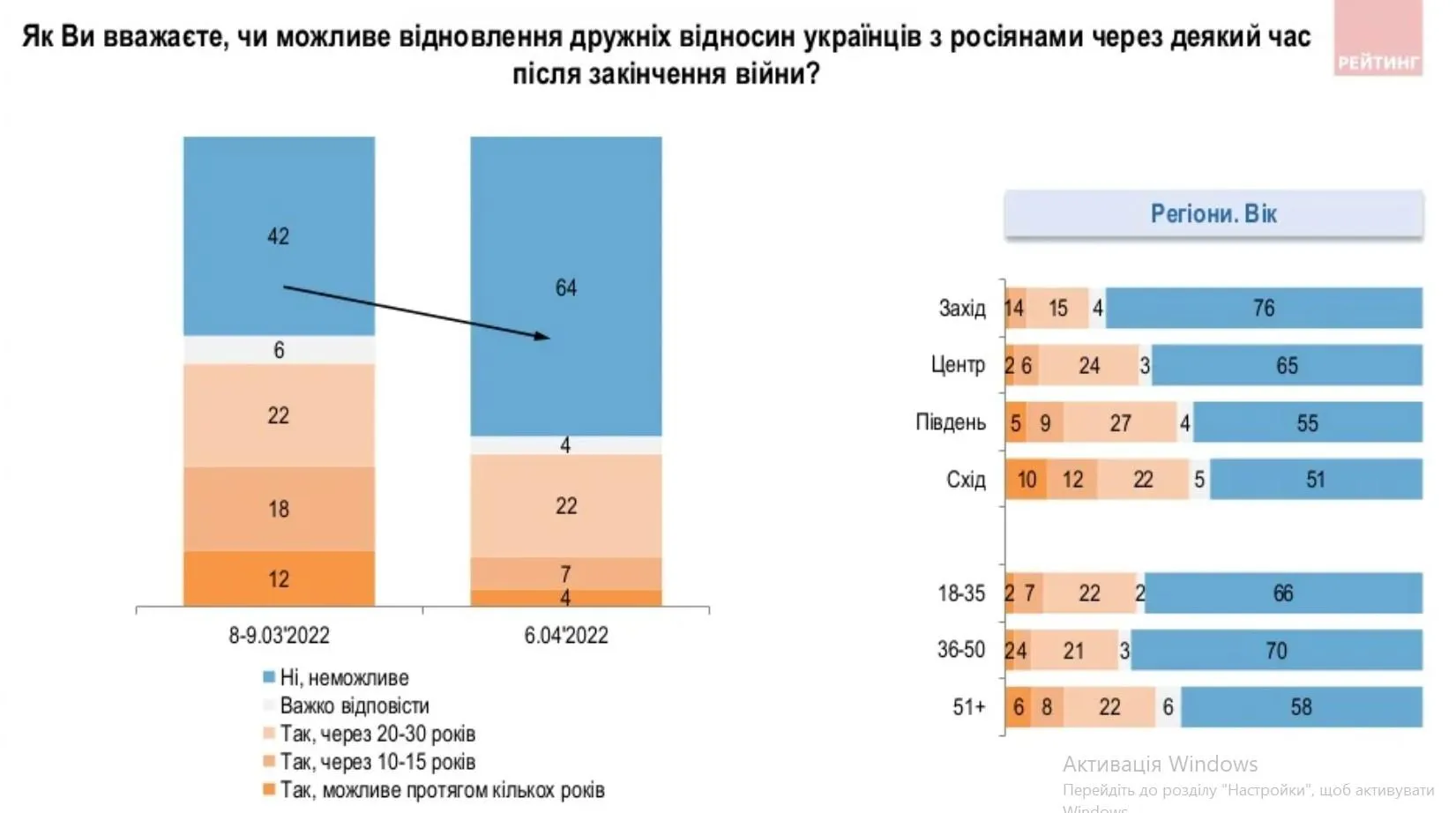 За останній місяць у півтора раза зросла кількість тих, хто вважає, що відновлення дружніх відносин українців з росіянами є взагалі неможливим (з 42% до 64%).