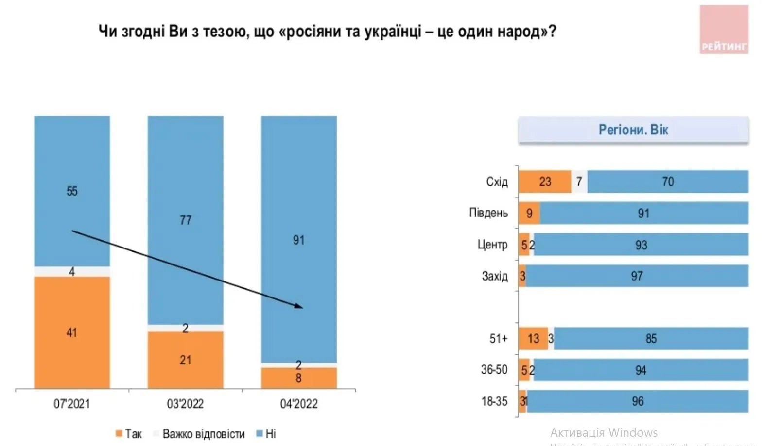 Абсолютна більшість – 91% опитаних – не підтримують тезу, що "росіяни та українці – це один народ". Тих, хто так вважає, сьогодні лише 8%,