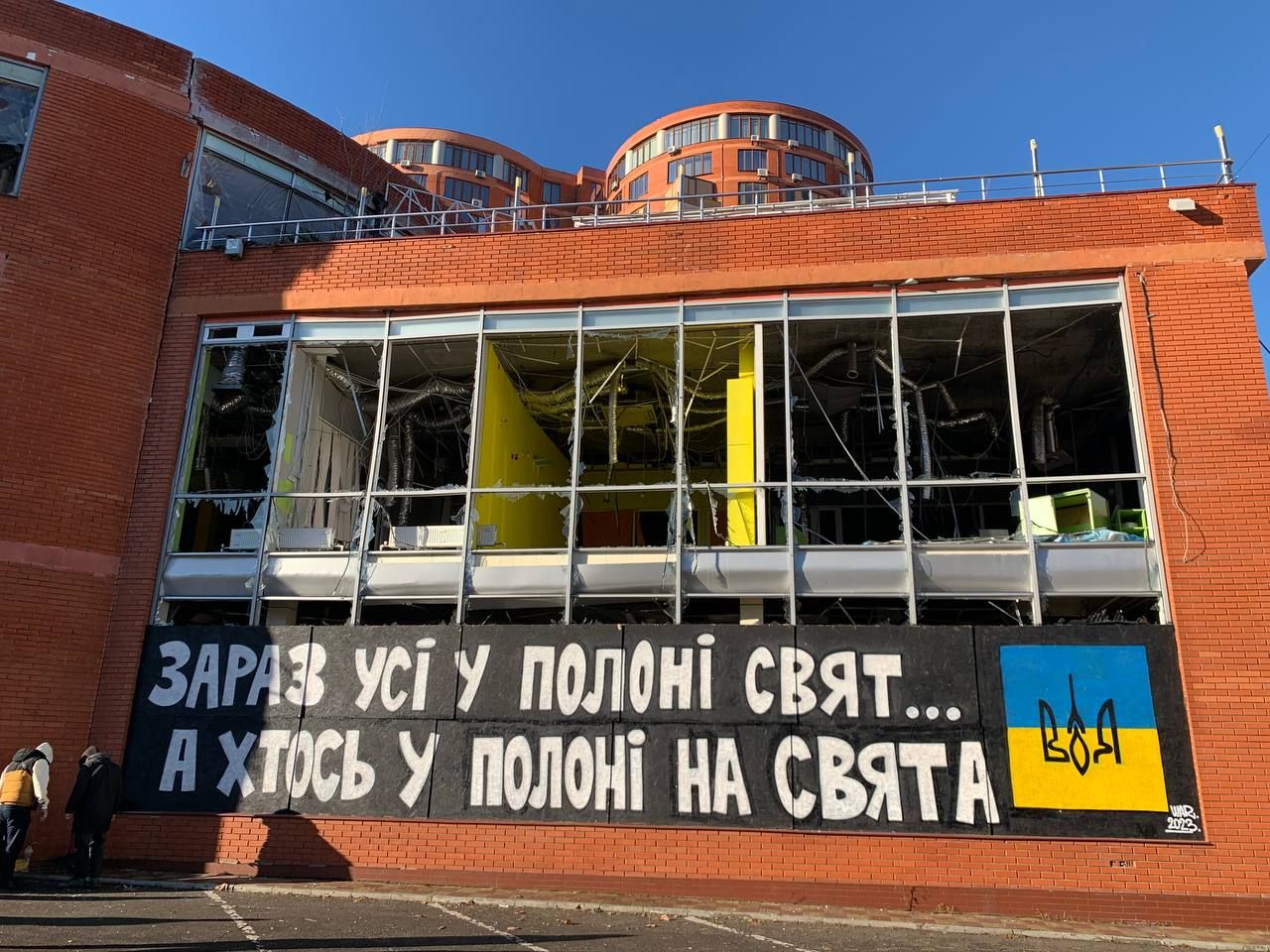 Листи фанери відкрутили й повернули назад. Тож на будівлі знову здалеку видніється напис-нагадування "Зараз усі у полоні свят… А хтось у полоні на свята".