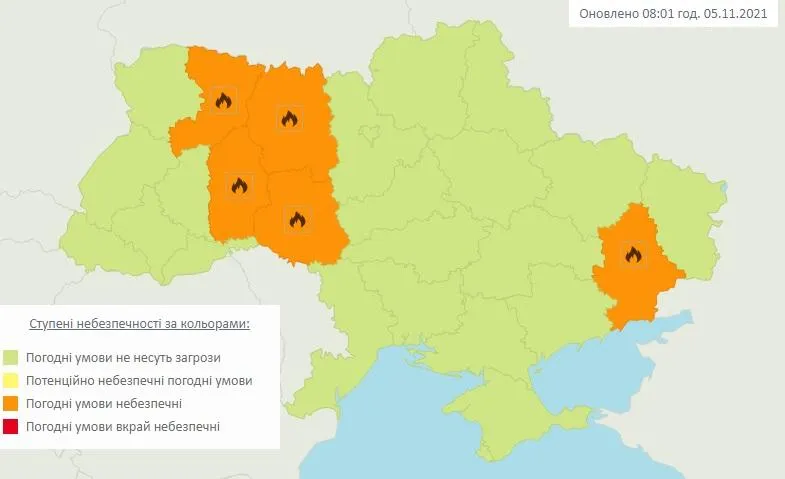 Водночас, за інформацією Укргідрометцентру, у декількох областях 5 листопада буде надзвичайний рівень пожежної небезпеки: