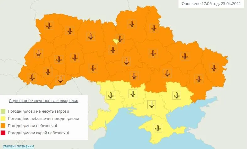 - У решті областей України очікують сильні заморозки у повітрі на рівні 0...-3 градусів. Майже по всій країні діятиме другий рівень небезпечності (помаранчевий).