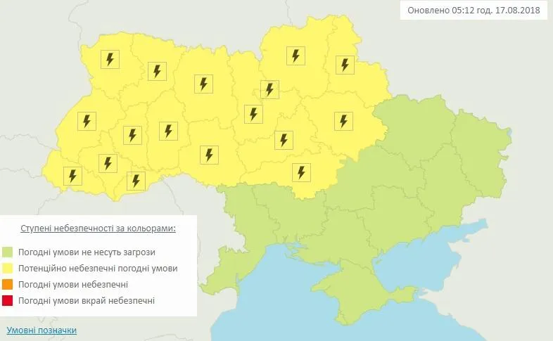 17 серпня у західних, вдень місцями і в північних та центральних (крім Дніпропетровської) областях грози,