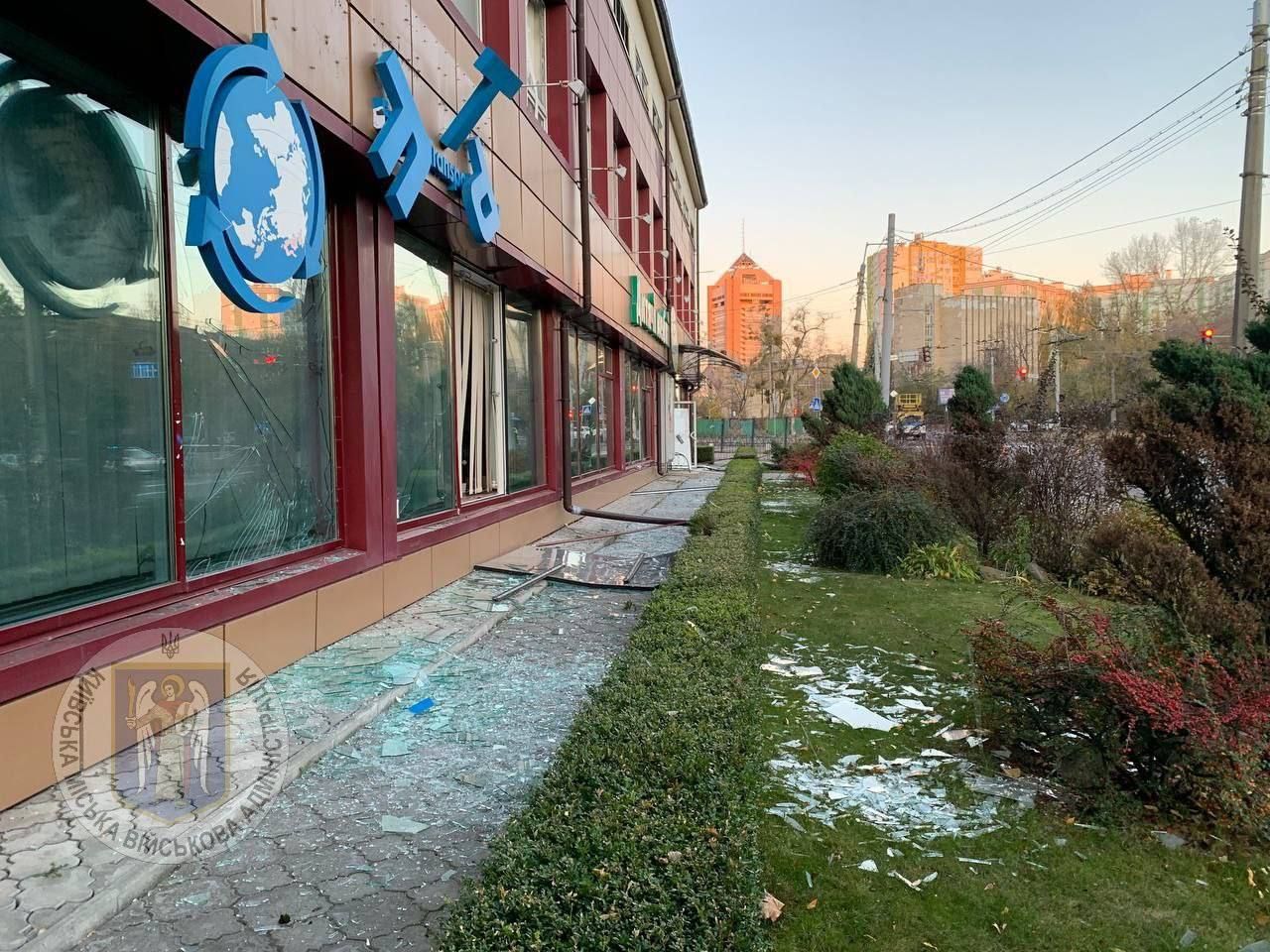 Пізніше у КМВА уточнили, що уламками пошкоджено дорожнє покриття, опора освітлення та електродроти. Вибуховою хвилею пошкоджено скління вікон гуртожитку на 1-му та 2-му поверхах та скління вікон в офісній будівлі з 1-го по 9-й поверхи.