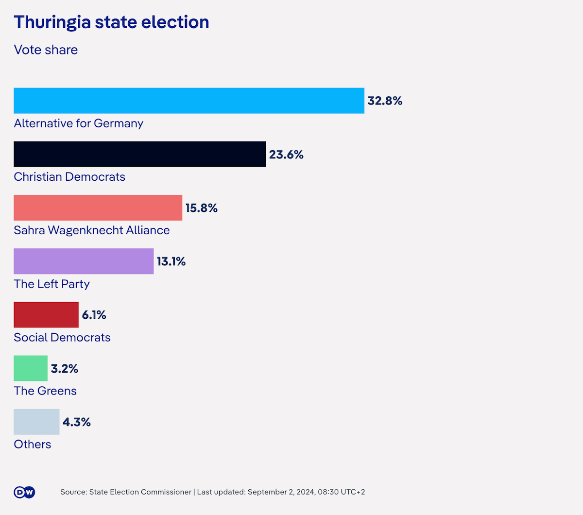 Оскільки це останні земельні вибори в 2024 (наступні пройдуть взимку 2025 у Гамбурзі), їхній результат буде перед очима в наступні кілька місяців і буде таким собі слоном в кімнаті для тих, хто голосуватиме на федеральних виборах 28 вересня 2025 року.