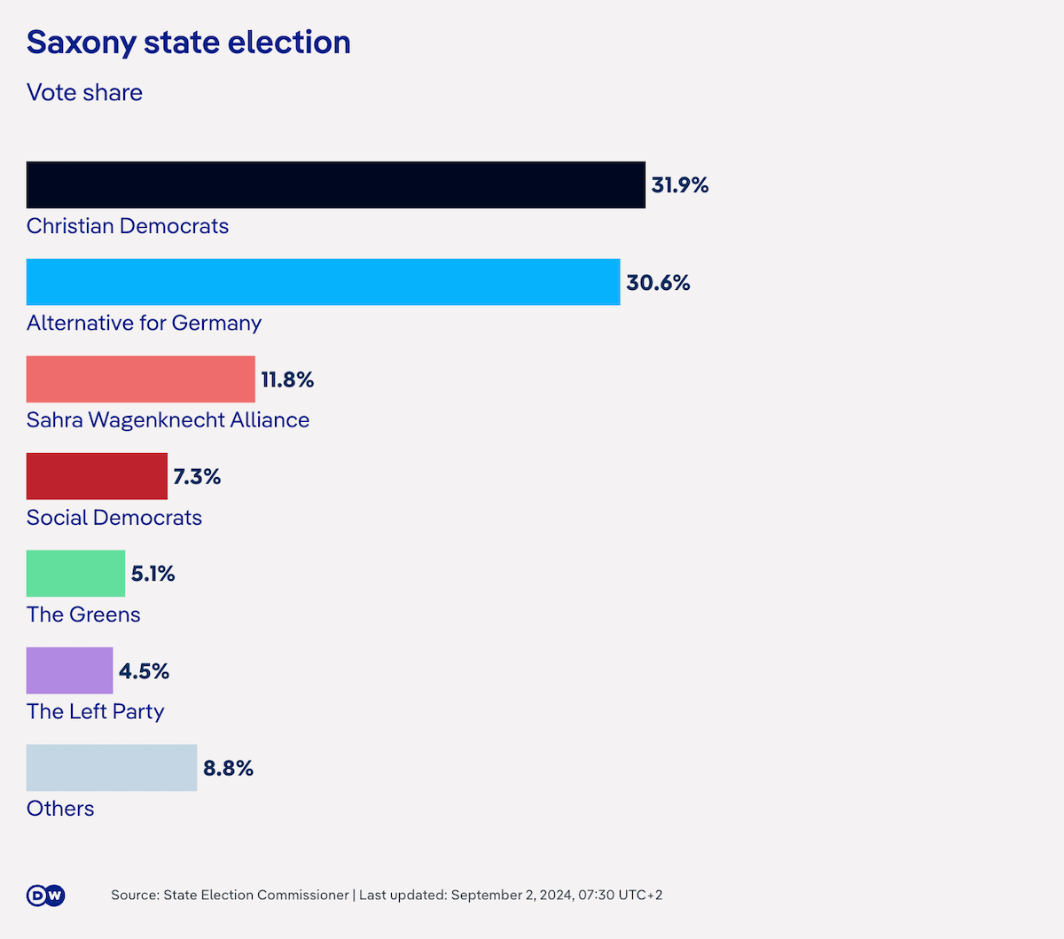 У Саксонії "зелені" все ж потрапили до ландтагу (5,1%) СДПН взяла 7,3%, а АдН завдяки перерахунку голосів через нібито помилку програмного забезпечення все ж позбулася так званої "блокувальної меншості", інакше було б зовсім кепсько. Втім, навіть друге місце з результатом 30,6% (перше взяли ХДС – 31,9%) говорить про дуже тривожні тенденції.
