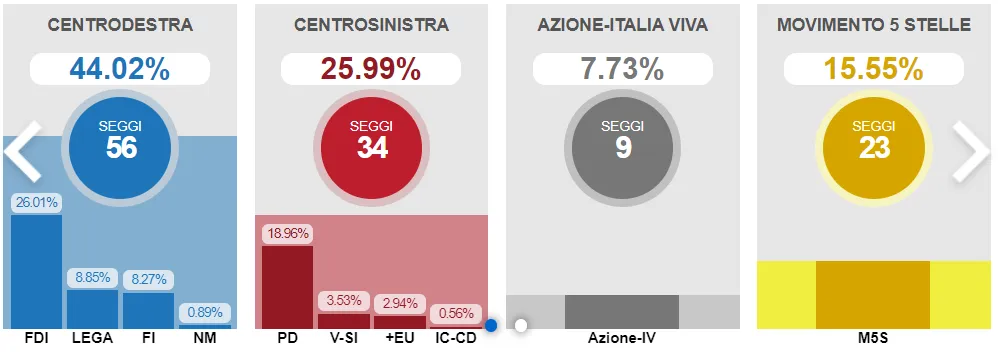 "Брати Італії": 22,5 – 26,5%; "Ліга": 8,5 – 12,5%; "Вперед, Італія": 5 – 9%. Головною політичною силою країни вперше стає права партія "Брати Італії" на чолі з Джорджією Мелоні. Саме вона претендує на посаду прем'єр-міністра країни, як лідерка партії, яка перемогла на виборах.