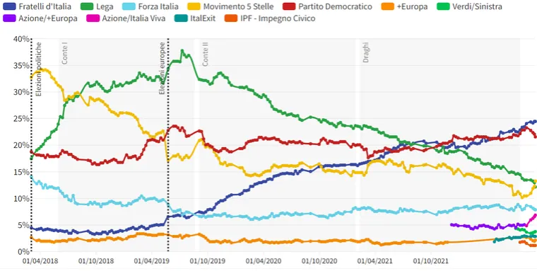 Очевидно що з поміж інших партій "Брати Італії", єдині стрімко виросли в рейтингу, фактично з самих низів. Інші партії або лише зберегли рівень підтримки, або опустились нижче. Зауважимо, що "Ліга" колись була на самій вершині, наративи партії були схожими до Fratelli d’Italia. Утім, на тлі невдач Сальвіні "Брати Італії" виривались вперед своєю переконливістю та перетягнули правий електорат на свій бік.