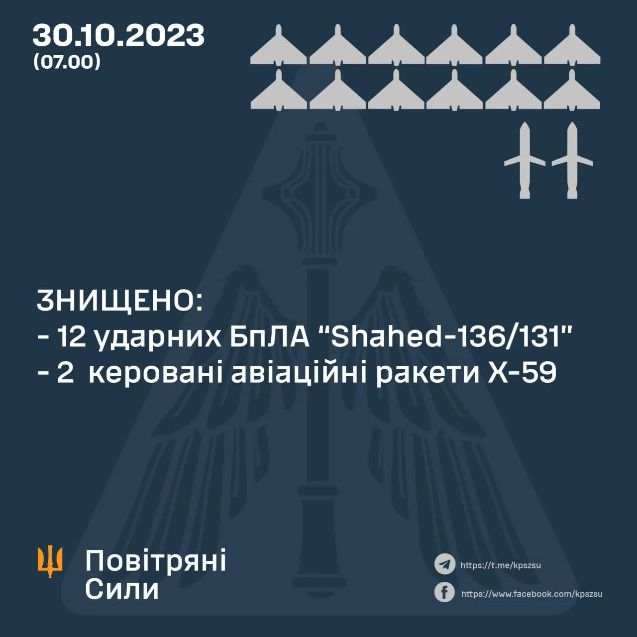 У ніч на 30 жовтня, противник завдав чергового авіаційного удару по Україні, застосувавши 12 ударних БпЛА типу “Shahed-136/131”. Протиповітряною обороною знищено усі 12 ворожих "Шахедів",